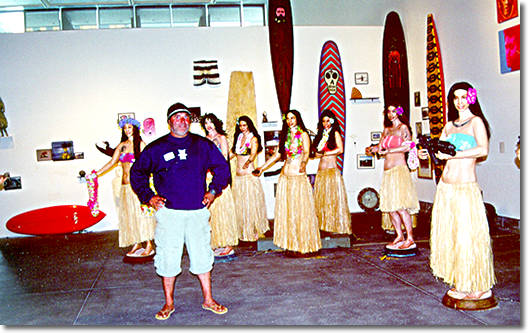 For California native Kevin Ancell (page bottom), there is no clear division between where art begins and surfing ends, or where surfing begins and art ends. The two are one and the same. "I never met a surfer who wasn't an artist," he said. "Every surfer you meet draws the waves." At least, every surfer that Ancell knows in his route while surfing both the northern and southern coasts of the Golden State. Ancell's works are currently on display at Surf Trip, the first Bay Area exhibit to chart the course of coastal California's surfing origins and culture. One of his works, "Aloha Oe," greets visitors as they walk into the exhibit. Aloha Oe is 25 life-sized hula dolls. At first glance, the hula dolls are dancing doing circular amis, or hip circles opening their arms in welcome while holding leis and ukuleles. But a closer look reveals that the hula dolls have bruised eyes and lips, needle tracks on their arms and tears of anguish coming from their eyes. Some of them are also armed with hand grenades and guns. What's to be made of this? Aloha Oe means "farewell to thee," said Ancell. It's a commentary on the harsh reality of life experienced by native Hawaiians - a far cry from the tourist-driven perception of life on the islands as a tropical paradise. It's also a commentary of the effects of western civilization on Hawaii it brought drugs, guns, and disease and pushed native residents from their lands. Downtown Honolulu is now full of as many strip joints and drug junkies as there are palm trees and mai tais. As Ancell put it, the classic story of "white man goes to a nice place and screws it up." The women were modeled after the dashboard hula that westerners turned into an icon of the "hula girl." "Western civilization's kind of rolled over them," said Ancell. But these hula girls are fed up, empowered and no longer willing to put up with it. "Now she's six-feet tall, she's holding a gun, and she's pissed," said Ancell, who lived in Kauai for several years and supports the Hawaiian sovereignty movement. "The small piece of sand and coral that she's standing on is all she's got left of her own identity and she's hanging on to it." Aloha Oe defies the paradise image of the Pacific Islands. Likewise, the artwork in Surf Trip debunks the notion that all surfers are stereotypical blonde, shallow beach-boys who have nothing to say besides "what's up?" and "surf's up." In reality, the surfing community is global and multicultural, with a rich and art-inspiring history. As mentioned in the exhibit, surfing originated in Polynesia more than 2,500 years ago, when the first Maoli king paddled his 17-foot-long, hand-crafted wood boat called an Olo Papa He He Nalu into the ocean and rode a wave. In the early 1900s, Hawaiian surf culture arrived on the shores of California and became a popular hit, particularly with television shows like Gidget. The rite of passage for any surfer is to ride the waves in Hawaii, according to Surf Trip curator Bob Carrillo. Although surfers can now head to plenty of other destinations in Bali or South Africa, those who seek the roots of surfing must look towards Polynesia. Over the past five decades, surfing evolved as an art form and this is reflected in the surfboards themselves. The first surfboards were carved from redwood or pine with no fancy logos and colors, and measured up to 16-feet long. They became shorter six or seven feet over the ensuing years and were made of lighter balsam covered with fiberglass and resin. Since then they have been mass-produced using polyurethane. In the last 20 years, according to Carrillo, surfers have gone back to the roots of surfing by returning to longboards of about nine feet. Carrillo traveled up and down the coast of California for the past two years gathering the art for Surf Trip. His goal is to "raise the level" of how people perceive surfing by eradicating the moon-doggie stereotype and presenting it as "a practice, way of life and rich source for artistic inspiration." He said the artistic community born out of surfing culture wasn't being represented. "You had many great contemporary artists that weren't being exhibited. So I wanted to create a place for that." Ancell is one of the artists that Carrillo chose for the originality of his works. Although the works on display at Surf Trip are surfing-related, the themes of his works cover a broad variety of subjects and are often explorations of his inner psyche. His works have been exhibited at the Laguna Art Museum, the Santa Barbara Contemporary Arts Forum and Catherine Clark Gallery in San Francisco. According to Ancell, surfing isn't just his life. It saved his life. At the age of 10 his father committed suicide and he was adopted and raised by a group of southern California surfers. They were the movers and shakers of the 1970s surf scene, and for Ancell, surfing became a way of life as well as a teacher of discipline; it helped him meet challenges and overcome fear. "Once you've gotten to a level that's really good, then you can do anything," Ancell said. "There's nothing that's out of your grasp once you put your mind to it. It builds your inner strength." That is where the art comes in. For Ancell, art is an exploration of the inner self and another form of self-expression. The paintings on display at Surf Trip are somewhat foreboding; they are political commentary on the dark side of life. But they are also spiritual and replete with symbols. One, titled "Burning of P.O.P." (1998), depicts the day Pacific Ocean Park burned down. That is where Ancell grew up surfing, and the painting is about the end of his youth. "The Death of Imagination" features an old and withering mermaid, who represents imagination. Ancell, like a lot of others, deplores the proliferation of the "dot-com" culture. He also has a personal axe to grind, as his art studio was recently purchased by a dot-com company. Ancell is in the painting at four different stages of his life, at one point