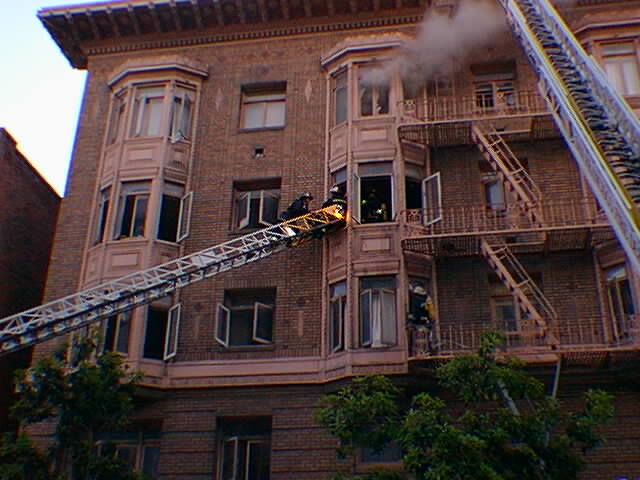An older woman and her daughter, trapped on the fourth floor of the apartment building at the corner of Bush and Jones Street, apparently chose to jump from their apartment window to avoid smoke and flame. The mother died and the daughter is in critical condition.