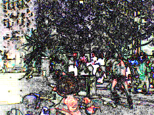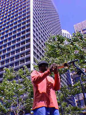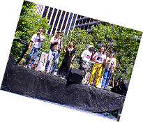 Some well known local names featured at the event were the Unknown Giants (photo left,), a jazz trio; Undercover Ska, a Ska band; and Teokalli, an Aztec drumming and dancing group from San Francisco's Mission district. There were groups from all over the world as well. Three came from Heidelberg, Germany. The city of Heidelberg sponsored one of the many stages at the fair and expressed its interest in becoming a sister city of San Francisco to promote cultural exchange.