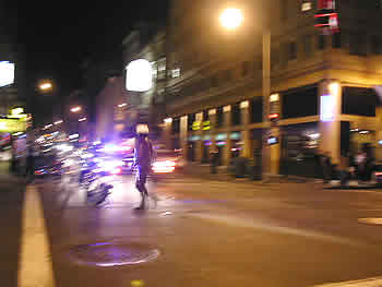 After shooting the photo of Skateboard's shine, I went into Club 21, which is located on the corner in the Tenderloin where almost anything and everything can happen, usually not good. There is a sign up on the corner that says a surveillance camera is being installed—maybe it has been already—but I don't see any effect. What's that going to do, anyway? Just force folks to some other corner where there is no camera. Without the camera on Turk & Taylor, at least you know where it is happening. But Frank, the owner of Club 21, runs a straight place. Or at least as straight as it can possibly be given the location. Sure, he's probably got some dealers inside, or some folks who are in charge of the dealers, but there are rules at Frank's place and they are rarely broken. When they are, it is often the customers that set the matter straight. But tonight there is no trouble, it is earlier than I usually drop by, and I notice a more upbeat feeling to Club 21 at this hour, about 10 PM, than I sense at 12 AM or 1. I guess folks are just getting into it and feeling good. Even the tunes from the juke box sound more positive. I watch the corner outside through the big windows, talk about the French presidential election with Frank for a moment (yep, the "brut", Sarkozy won), then head over to Cafe Claude to catch the music for a moment—it's Jerry Oakley's trio—then walk up Bush to Le Central. At this hour Le Central is winding down. It has an older crowd that eats earlier and drinks less after dinner than the folks at other places in the area. I like the quiet and stop by to talk with Dave, the bartender, as he is cleaning up. He's already cleared the register. "Cash"? he asks. "Cash," I say. He pours me a shot of Bourbon and goes back to slamming the dice on the counter with the boss and the last customer when a young Mexican guy staggers in. You don't usually see people staggering drunk in this part of town. Even back in the Tenderloin they are kind of discreet about it. He makes it to the bar but all eyes are on him. Dave comes over and says he is sorry but can't serve him. "You've had enough. I don't want you to get into an accident." He suggests that the Irish Pub down the way in the alley might serve him. I have my doubts that even the Pub will serve him. Best to go home, sleep it off, but I don't say so. I don't want to hang things up, so I pay for my drink and I head up Kearny to Sacramento and wait for the number 1 bus that runs up the hill. At this hour there can be a wait. I'm looking across the street when I see a figure staggering on the sidewalk on the other side of the Kearny. I can't see very well but it looks like a young Chinese woman. She has a pack on her back like a student. And she is really staggering. A couple of times she looses control, does a complete circle and ends up walking in the opposite direction. Then she does little circles on the sidewalk and looks like she is going to fall on the side of the building or collapse head first on the sidewalk. I see plenty of this kind of thing in San Francisco—we're not that far from North Beach—but not usually this extreme. And a young Chinese woman does not fit the role. I make a 911 call. I think somebody better check her out before she gets hurt. I don't want her to end up like Skateboard. The bus comes and I get on. It now dawns on me it is Cinco de Mayo. Do the Chinese now celebrate that too? They have a lot of holidays but I don't think this one. Back on the hill, I pour myself a glass of wine and relax. About a half hour later the phone rings. Surprise! It's the police. They are now on the scene. I say it was a half hour ago. They say it has been a busy evening. I guess so. An hour or so ago I was headed up Taylor to Union Square when a motorcycle cop stopped traffic in the intersection to let about 10 other motorcycles and several escorted cars go whizzing through. It looked like Willie Brown days had returned. And such fanfare. Down the street at the next intersection the same thing, as if nothing could stop his or her holiness, or whoever it was, for one moment. Then us dull pedestrians were back to waiting for the signal to change.