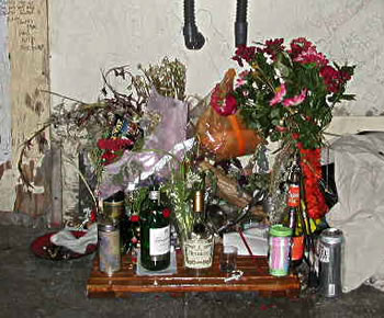 San Francisco—May 5, 2007 A week ago I passed it by and did not think to shoot a photo. It was a little wilted now but I shot anyway. "It" was a shrine for "Skateboard," the black guy without legs who got hit by a mail truck down in the Tenderloin. I didn't know him but I used to see him occasionally. Now that he was dead, the full story came out. He lost his legs at age 6 in an accident in Oakland. He adapted to a life without legs via the skateboard. He was 48 years old. He was drunk most of the time but never a problem, said the owner of the liquor store on the corner where he often used to hang out and where there is now a small shrine for him. He was also a dare-devil on a skateboard, cutting recklessly in and out of traffic. Some were surprised it hadn't happened sooner. He wasn't very tall on a board. The driver of the mail truck says he didn't see him. Quite possible. Now there is a shrine on Taylor, just up from Club 21 on Turk. Aside from flowers, it includes some of Skateboard's favorite things, like a bottle of Hennessy.
