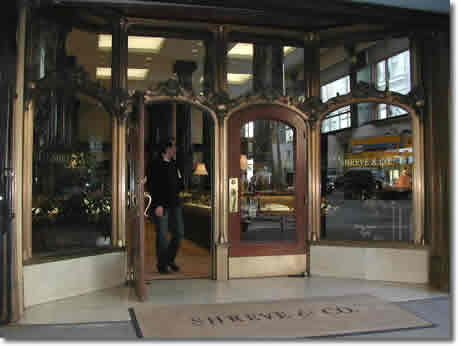 Dreamy-eyed, I leave Margaret putting labels on a new show and wander around downtown. I come to Shreve & Co. jewelry on Post and Grant. I usually just look in the window but today I decide to go inside. If you don't know Shreve's, it is of another era. It is like something out of a movie. I'm surprised when I walk inside that the color does not change to black and white and I don't spot Charlie Chaplin and Alfred Hitchcock somewhere. I go down the aisle on the right looking at men's watches. I have done this before. These are not real watches as most people know them; they are show pieces. You wear one of these watches, if you dare wear one in public at all, to attract attention. It is like driving your beamer or Mercedes right into the cocktail lounge. People know you got the green stuff. They know you are a man of class, whatever that is. But I soon grew bored with watches and wandered over to woman's jewelry. Watches are nice to look at but if you want sparkle, go to woman's jewelry. I wandered down the main aisle back towards the door, then up the far aisle till I came to a particularly dazzling display of diamonds and rubies: Two bracelets on a single post. I don't know why no one was helping me, as customers seemed to be outnumbered by employees in back of the counters, but maybe that is the ploy they use in the fancier jewelry stories: leave the customer to stare at the stones until memorization sets in, then make the kill. But I didn't have all day. I wanted prices on these two pieces that had become blazing stars in my eyes. I got the attention of a clerk—I probably had "that" look at this point—and she actually took both pieces out to show them to me. She was young but very calm and sincere. She had her hair pulled back nicely and was dressed conservatively but with just a hint of seductive sophistication. She was not part of the San Francisco I know today but I liked her nevertheless.