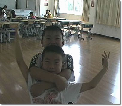 of the time. Of course the main trick to maintaining control of a young class is to be entertaining. You can do that by playing games but that would not be quite fair to your mission, mainly to teach them some English. So you try to make your lessons as game-like as possible, or at least talk on their level about things they know and care about. And don't bother with abstractions; they don't know what they are. If you are one who has been taught to believe that "be concrete" is the only way to teach or live, then eight-year olds are your perfect students. To them anything that is not concrete is just so much air vibrating your vocal cords. It took me a few days to get this. I have mostly thought on the college level. One of my brightest students, "Linda," or Jiang Yu Chen, began sending me notes: "Teacher, we don't understand." Always with a smile of course. I learned to bring the lessons down to their level. I rarely discussed grammar openly. But I did find a way to teach some grammar things without being too obvious about it: "Maya, come up here," I said one day. Maya was only too happy to come up front with teacher. Now "Maya," or Kuai Le, is standing in front of the class with me. "Where are you?" She looks at me wide-eyed with that I-don't-understand look. "You're here," I say. Say it, "I'm here." "I'm here," she says and seems satisfied. Then I take here by the hand and we walk over to the other side of the room. "Now where are we?" I ask. She is not sure. "We are 'here'," I say. "We can only be 'here' right now. We were 'there'," I say, "but now we are 'here'." And I point to where we were. Then I point to here and say "here" and point to where we were and say "there."