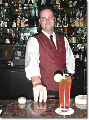 "Okay, let's do one." As Max mixed, he explained the drink to me. "This cocktail is the marriage of a couple of ideas. Pimm's is used in a traditional drink called a Pimm's Cup. It's a nice brunch or breakfast drink." Pimm's was created by James Pimm in 1820; he served it at his oyster bar in London. The base of the drink is an aperitif that includes herbs and quinine. Like bitters, such as Campari, its original purpose was digestive. Pimm's No. 1 is gin-based. The recipe for a Pimm's Cup include these ingredients: a shot of Pimm's No. 1, 7-Up, a slice of cucumber and a twist of lemon peel. An additional ingredient to Beau Coup's Pimm's Rose is Hendrick's gin. Hendrick's includes rose petal, cucumber, coriander, among other "botanicals." According Alan Cohen, who sells Hendrick's for Young's Market Company and who just happened to be on hand at Beau Coup, "One of the head distillers from William Grant Company, which makes Glenfiddich in Scotland, is an Englishman, and he wanted to make a gin. He was trying to decide what would be an interesting approach to a new gin. He wanted something ultimately British, and what is more British than cucumber sandwiches in a rose garden?" Hence Hendrick's fits perfectly with the idea of Pimm's Cup, or a new take on that drink, which is what Pimm's Rose is. The flavor of Hendrick's, according to Cohen, is more delicate and refreshing than most other gins, and that quality comes from the cucumbers and rose petals. Since we have already digressed a little, let's do it some more. Gin drinkers do so. Why can't we? Now here's the thing, love: Gin is an interesting drink when you know a little about it, and it can be a real turn-off if you don't. The primary flavor comes from infusing juniper berries and other botanicals into a neutral grain spirit. Distinctiveness of individually manufactured products is due to the choice of the other botanicals by a manufacturer. Thus it involves a kind of herbal witchcraft, just as does Vermouth and Campari. One other tidbit: They used to claim that gin caused amnesia. Don't know whether this is true or not, but if there is something that you would really really like to forget, gin might be just the thing for you. Recipes are of course highly guarded secrets. Now back to the main topic: Max also likes the drink because it is a "long drink." Says Max, "You don't see that very much these days. Most people are drinking anything that will go into a Martini glass." The flavors are unique, he says, but not overpowering. A long drink, in case you don't know, is any drink that does not go into a Martini glass. The Primm's Rose goes into a Collins glass, which is tall, not long. What is long about the drink is the time that you might take to drink it. It is a leisurely drink. Says Max after some additional thought, "It gets this really nice, well balanced botanicals from the gin and the herbal essence of the Pimm's." According to Cocktails by Harrington and Morehead, the Pimm's Cup "gets as close to health food as anything we'd care to recommend." And I think you can say the same for Pimm's Rose. The ingredients for Pimm's Rose are as follows: half an once of Pimm's, an once of Hendrick's, an ounce of cranberry juice, half an once of lemon juice, a dash of simple syrup. Topped it off with ginger ale. The garnish is a lemon twist and a wheel of cucumber. The drink was concocted by Marco Dionysos, who was traveling in Spain at the time of my visit to Beau Coup. I don't know if Jack Kerouac or other heavy drinks would go for this drink. But like Primms' Cup, it is a drink that is designed for all day drinking. Jack would surely appreciate that. Home | City Notes | Restaurant Guide | Galleries | Site Map | Search | Contact
