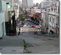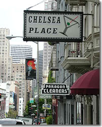 back down to Broadway. I unusually see these step from the other directionfrom Broadway looking up. And there is usually one or two wasted looking characters with a bottle or a joint part way up sitting on those slab-like steps that run up the hill. I don't know how old the step are but they don't look like they were made by any contractor according to city regulations. They are as irregular as the characters who sprawl upon them. Though I don't have a bottle or a joint, I'm now looking at the view from the steps down Kearny and clear down to Market. It is a marvelous view across town. If I had a joint and a bottle, maybe I would sprawl here for awhile. It is the talk of the truly spoiled child. It is the talk of one with "attitude" who makes assumptions about what one deserves. It is the talk of one who does not actually have her nose stuck up in the airthat is not the style these daysbut sounds like she does. "Las Vegas has things that San Francisco doesn't," says one young-un to another. I don't stick around to find out what. No wonder Enrico is sour these days. I STOP BY CHELSEA PLACE