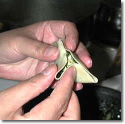 I love 'em. She is pinching shut the small pancake containing shrimp,