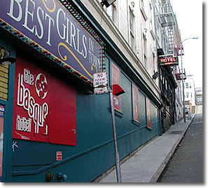 Don't know if there is any law against waitresses hitting on you. As Agostino Crotti, owner of Tammaso's, says, food and sex kind of go together. Not that Tommaso's has anything to do with the sex industry, but they are surrounded by it over there in North Beach. Next door is a video shop advertising the "nastiest videos in town." Across the Street is the House of Ecstasy, the Lusty Lady, and the Hustler Club. And practically right over head is an "Oriental" massage place. FOR ONCE I walk up Romelo, the little alley by the Hungry i, to the Basque Hotel. I see that the hotel is more than a hotel; it is also a bar. This may be a discovery for me. It is a quiet place. In fact, there are no customers at all, just a big bar and some empty tables by the window looking out on the alley. I look around wondering if it is really open for business when the bartender comes out of a back room. I ask a few questions. She is a blond young lady who looks preoccupied. Could there be a boyfriend who is not behaving as she would like? Are her parents perhaps not happy with her North Beach life style? Is she having trouble with this month's rent? You can see some combination of this in the pinched expression of her face. VALLEJO IS AT THE TOP