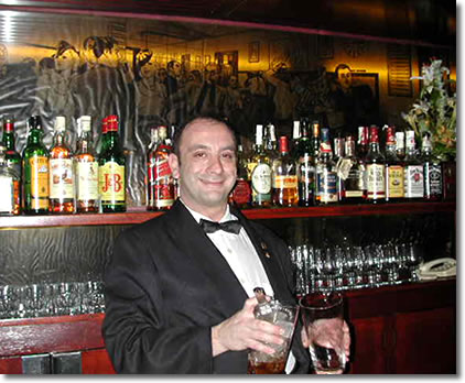 Here each dish we ordered is distinct and wonderful. While they do not hit us with a lot of food, each dish is highly memorable. Now you may be wondering, did we talk while we ate? And if so, did we talk only of food? Of course we talked, and we talked of things other than food. We talked about George Bush and the United States but found that not such an appetizing topic. We talked about Dick Chaney and oil and pollution. Ditto. Then we talked about my daughter's new boyfriend. That was a much better topic. Mostly I pay little attention to her boyfriends; they come and go like the season's of the year. But this new boyfriend of hers I found interesting. He's not Spanish; he's actually from Argentina. His family has two chocolate shops in Puigcerda. He has a rich sounding voice and a thoughtful manner and appears enamored of my daughter. I think he may be around for awhile. I guess I can say his name. It's Emiliano. Most non-native Argentineans came from Italy and Germany. He is a combination of those two ancestries. He explained to me: "There are no native Argentineans now. They killed them—every last one." His voice is sad. On Friday we took it easy and stayed in town. We looked at the Tower, all that is left of the destruction of the church of Santa Maria during the Spanish Civil War. Much of the town in fact was destroyed in that war. We walk around the frozen lake. And we test a technique we have come up with for making quick decisions about restaurants. We go into a place at the end of town by the lake. It looks good outside with a nice well-lettered sign but we are not so sure. We order "Martinis" at the bar, then watch the food that comes out of the kitchen. In fact, we can see right into the kitchen from the bar. We agree that the chef doesn't look any too bright. My daughter mentions the inbreeding in Puigcerda; she claims that explains the somewhat high number of dim-witted people there. The chef truly appears to be one of them. Looking from table to table we mostly see fried potatoes and sausages. We decide to pass on this place with the well-lettered sign. She remembers a place down the street on the edge of the hill overlooking the valley. We go to Braseria Sant Jori. The Sun is so bright we get a table back in the restaurant where we can nevertheless see the snow-capped mountains across the valley. The food is good, the pace slow. So slow in fact that eating is beginning to seem more like dreaming. At some point in the meal, Emiliano, on break form the chocolate shop, shows up for a visit. He is a welcome interruption to our food-dream. On Saturday Antonio loans us his jeep and we drive down to Barcelona. I'm leaving for Paris at 3:30, but that leaves us time to visit the Basilica. It is huge and the sound of the organ is unearthly and beautiful. It almost brings tears to my eyes. It is kind of beauty that I have forgotten about. Then we take an elevator to the roof and stand on top of the Basilica and look out over all Barcelona—towards the Mediterranean, toward the hills, and all over the city. I am awed with this vision. We are no longer staring at plates of food and it is inspiring. There is not much time left now but we go in search of the famous Boadas bar. I have the map that Marco drew. At Ramblas we catch a cab towards Playa de la Catalunica. Boadas, according to Marco's map, is on the street before the playa. It is very crowded in the streets, as it is Saturday, but the driver gets us there. We start to wander down the street looking for Boadas when my daughter looks up and spots the sign. Boadas is right on the corner. It is mostly dark wood inside and the shape of the room, due to the corner location, is triangular. There are only a few customers. We go to the far end of the bar where there is no one and the bartender, hair slicked back and dressed in a tuxedo, comes over. His name is Albert Monterrat. When I tell him that his bar is famous clear to San Francisco, and that I'm pleased that we were able to find it, he opens a cabinet and gets out a book. I don't know the title but it contains recipes of cocktails as made at Boadas. It is an old cloth-covered book and the pages are not slick as in the books on cocktails that you see these days, but it has good color pictures of drinks. The original owner or the bar was Miguel Boadas, Albert tells us. His daughter, Dolores, now owns the place. They are famous for mixing drinks by tossing the fluids between two mixing glasses. Albert suggests a Manhattan and demonstrates. The trick is using two really large mixing glasses. The Manhattan is one of my favorite drinks. I feel at home.