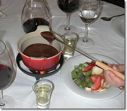 There was dessert of course, there was coffee; there were more drinks, even Champagne, I think. There were toasts and my awkward Spanish caused much mirth, as only something raw but heartfelt can. There was much conversation, some of which I understood. When I didn't it was at least interesting to listen to the full rich passionate sounds of the language. It was truly La Comida Fantastico. I believe I backed out the door when it was over, bowing in respect to the chef. The woman with the touch of fire in her hair looked pleased with herself. And me? Well, I didn't really deserve this. Why God had granted me such a feast and such beautiful and youthful company I will never know. The next day found us visiting a 10th-century church in Pedra. It is up on a hill in farm country and of course made of stone. It reminded me of some of the adobe missions in California, but of course it was much older and better preserved because of the stone construction. It was also of a small scale, which made it feel personal. You could picture actual people there long ago. The hill on which it stands is still a place of quiet. From there you can look out over the valley. Stand for awhile and you see generations coming and going, living out the story of their time, then gone from the earth. It is a sad feeling but a holy one. And I'm ready for a drink and some lunch. I don't want to feel sad today. The snow is fresh on the mountains and the sky is clear. From Pedra we head back up to Puigcerda, then cross the border into France. We are headed back to Llivia but to a different restaurant, Formatgeria de Llivia. Along the way I notice the big rolled "bails" of hay and the stone fences in the fields. The fields are wet and brown. There is almost no green anywhere. Yet all is very fertile looking. Formatgeria de Llivia is spacious. Out the big windows and across the valley you see the snow on the hills up in the mountains. There is just one other couple dining. We seem to pick the perfect hour for service. The owner comes over and we talk about Martinis. They have Yzaguirre. We order two and a cheese plate appetizer. Formatge, if you don't know, means cheese in Catalan. La Formatgeria specializes in cheese and beef. If you like these products, you are in heaven; if you are vegetarian, you are in the other place. A platter of cheese arrives ranging from mild cow cheese to blue goat cheese. We work our way from mild to strong. Then we examine the menu. It is both in Catalan and Spanish. On one side it lists traditional plates, on the other, alternative ones. We go for the alternative ones. I order (Catalan) Filet de Boe amb verduretes i salsa de gingebre, my daughter orders Glates d'iberic amb moniato I castanyes. Mine is strips of beef and vegetables with a ginger salsa. The glates is the meat from the cheeks of the cow. The glates is as tender and flavorful as a stew. With this we drink a bottle of Mauro 2002 Tempranillo from the Castillar y Leon region. I like the Spanish wines very much. They are intense and flavorful. I am surprised I see so few of them in the United States. For dessert we split a chocolate fondue with assorted fruits, one of which is new to me, a large red grosella berry. It is about the size of a California Holly berry but has the color and translucency of the Red Huckleberry.