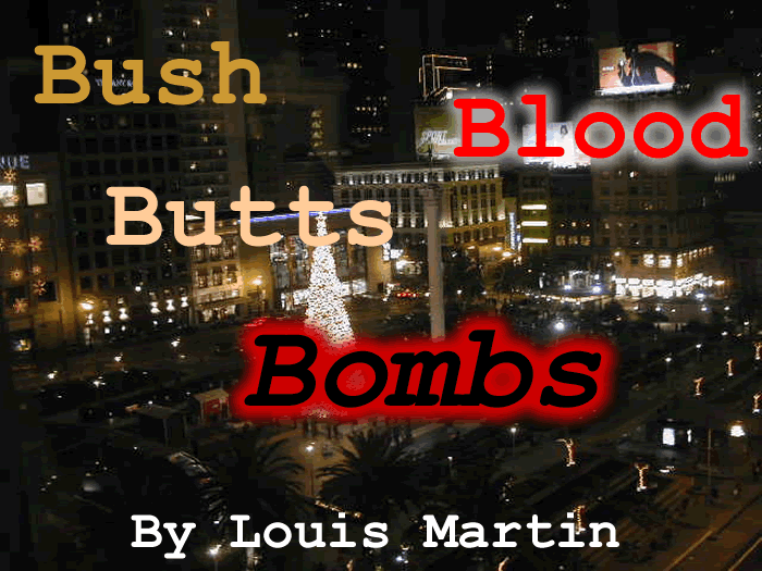 Bush, butts, bombs, blood. Your blood, my blood, our blood, theirs. All in a flood. Bushful flood of moaning and groaning. And if your mood is wrong, you are wrong and you'll just have to swallow a Cheney, this little metal pill that will make you think twice before you ever dare think again. End all now. Why not? So what? Miles to go before I Davis. Sivad Selim. Put her in reverse, then let the clutch out. You'll have fun. 'nuf this? Evah Ll'uoy. Be patient out there in the desert. Don't touch your thing or hers. It might explode. There are terrorists everywhere. In her brain, on her lips, behind her smile. A smile is not a smile, a kiss is not a kiss. Beware. She is a bomb in bed. Have sex and die. If you can't say fuck, you can't say fuck the government.—Lennie Bruce Keep that word around. Also try a prayer. These are desperate times. Semit. The Bushman is all aflame in the desert. Bushman speaks in tongues in a language no one knows. Surprise? Who wants one? Surprise your eyes by taking off your clothes and facing the mirror. Mirror, mirror, what is this thing? Does it sting, does it sing, does it have a name, what's it game? And who pinned it on my donkey? Why so bare? Please don't stare. And does the Bushman have one too? An illiterate prick? Bushman, BM, Be 'em. The mind breaks down under the weight of such nonsense. Forgive us all! If you can't say fuck, you can't say fuck the government.—Lennie Bruce I get a kick out of the French Connection logo, Fcuk.