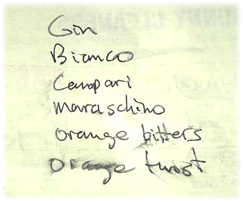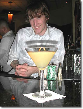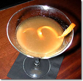 to having drunk one just before going to bed. He But now we were having a serious conversation about the Bronx. I had seen a beautiful looking version of the Bronx in a book called The Art of the Cocktail by Philip Collins. Problem is: when I made one, it didn't taste as good as it looked in the book. It was more like a weak Negroni. It didn't make you hungry or horny or anything. Still I had hopes for this B drink. Anything that looked that good, I reasoned, ought to taste good with a few tweaks to the recipe. Now the classic formula calls for 2 oz. of gin, 1/2 oz. of orange juice, 1/2 oz. of dry Vermouth, and 1/2 oz. of sweet Vermouth. Not a bad combination but a little pale tasting to a seasoned Negroni drinker. One could say that it was just lacking the Campari and put in a shot, but that would be a cop-out. I felt there was a drink there, distinct from the Negroni and satisfying on its own terms. Thomas was of the same mind. We shared a vision, not of conquest, but of perfecting something for people of peace to enjoy. Having said that, I must admit, however, that Thomas is a little frightening when he goes to work. Warlike? No. But he is fast. Bottles seem to sail through the air in formation, jiggers do what jiggers do, dumping measured amounts madly into mixers, and shakers shake like the San Andreas fault on doomsday. He has the look of the mad scientist, a kind of Dr. Strangelove in the bar. But no worries. He is not plotting your destruction like some in this world; he is plotting your pleasure. But enough nonsense. Sense and nonsense must be kept in balance, just like sex and nosex, xeson & xes. Here is the reformulation he came up with: 2 oz. Plymouth gin, 3/4 oz. Bianco Vermouth substituted for the sweet Vermouth, 3/4 oz. dry Vermouth, couple wild dashes of orange bitters, and fresh-squeezed orange juice, garnished with a long strip of orange peel. He shook vigorously to produce a nice icy texture in the glass, somewhat suggestive of an orange slush. The result was very "drinkable," an odd word to some for describing a cocktail but if you know alcoholic beverages, then you understand what it means: easy to drink and enjoyable. One note: The color was a little different than that shown