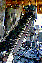 | Typically, harvesting the grapes takes place during the month of September. September 1st through the end of October, to be exact. Some still practice the lost art of picking the grapes by hand, while others have gone the way of modern technology. How modern, you may ask? Well, nothing high-tech by Silicon Valley standards, but this machine is big enough to dominate the vineyard, grab only the biggest, and fattest grapes, then send them back on a conveyer belt for pressing and fermentation. | ||||